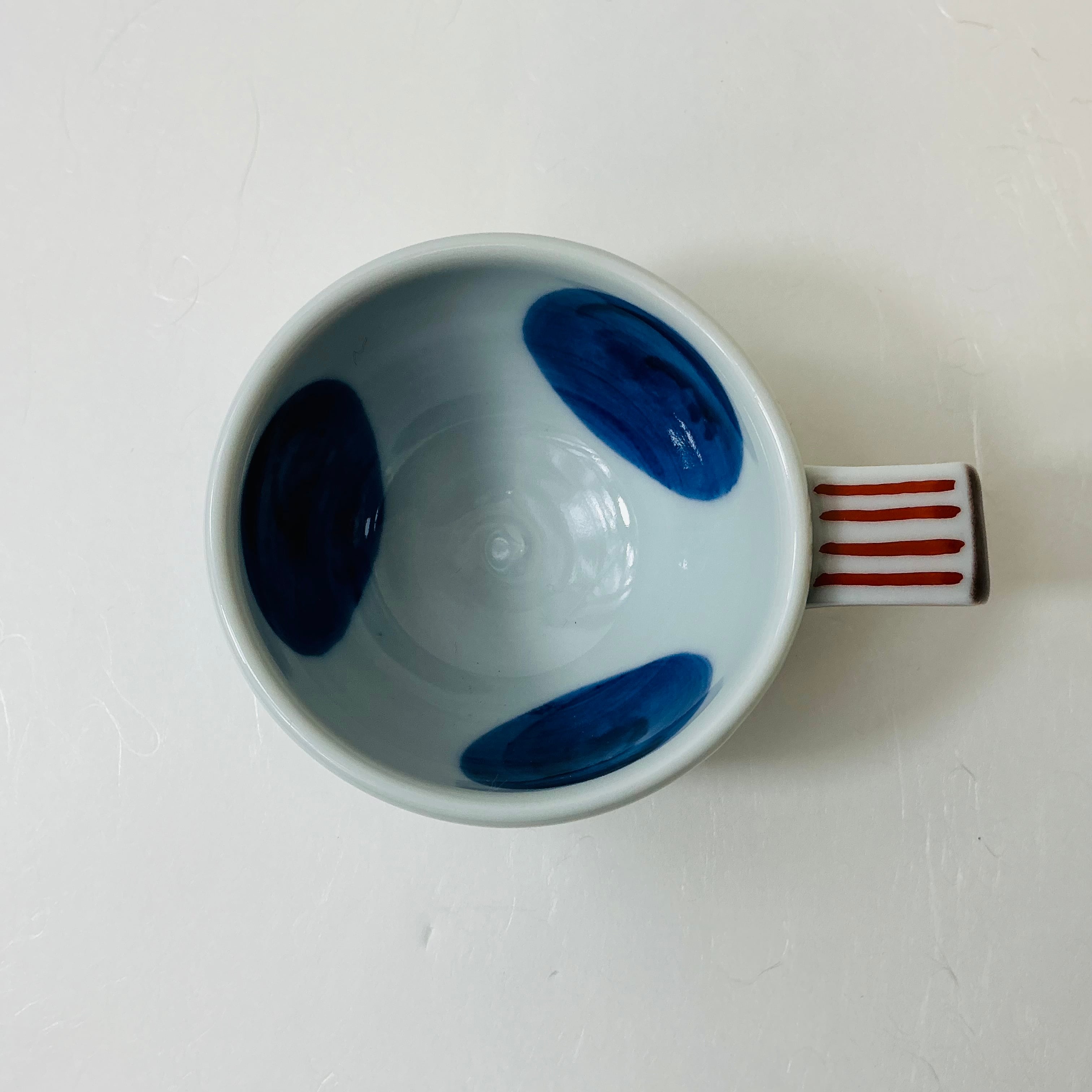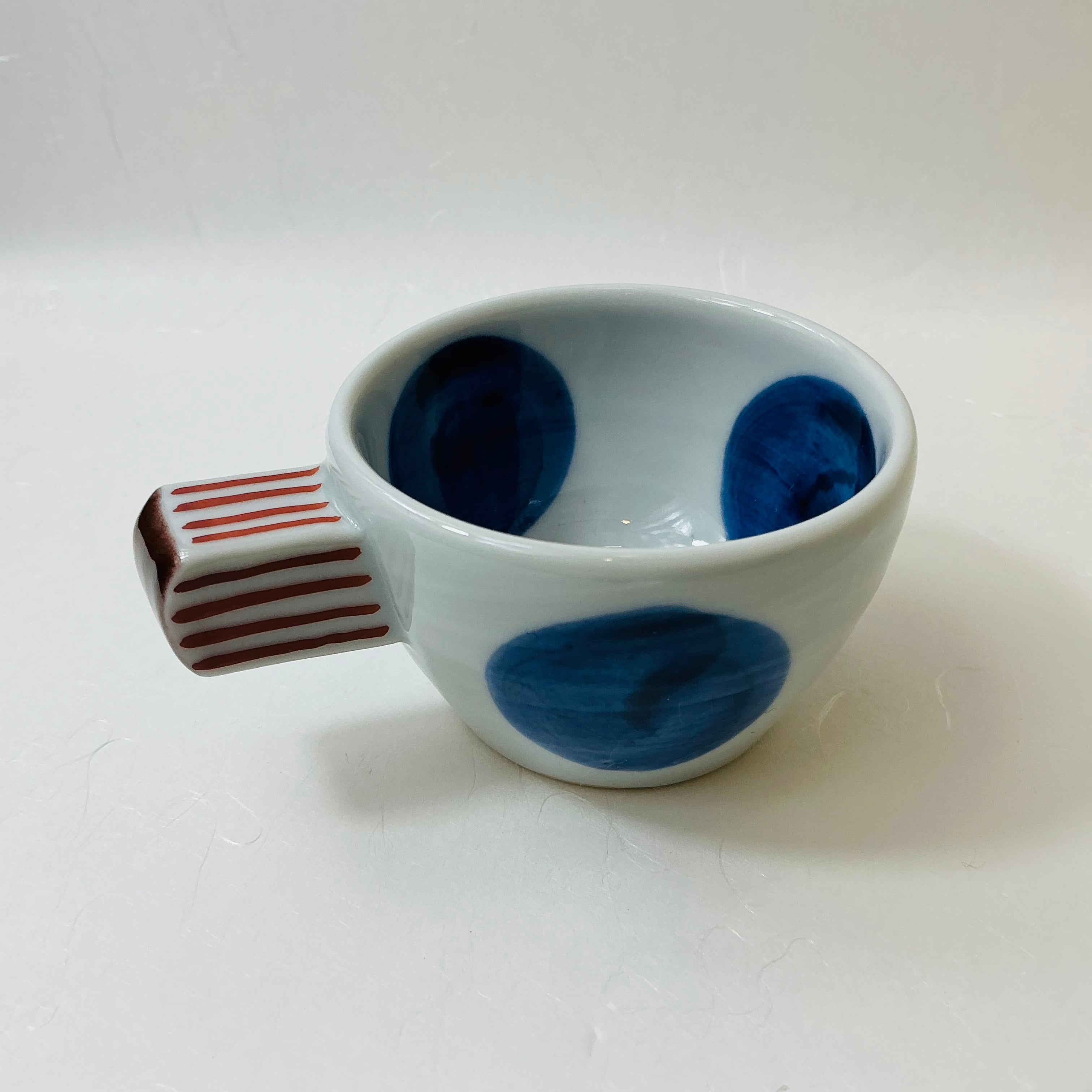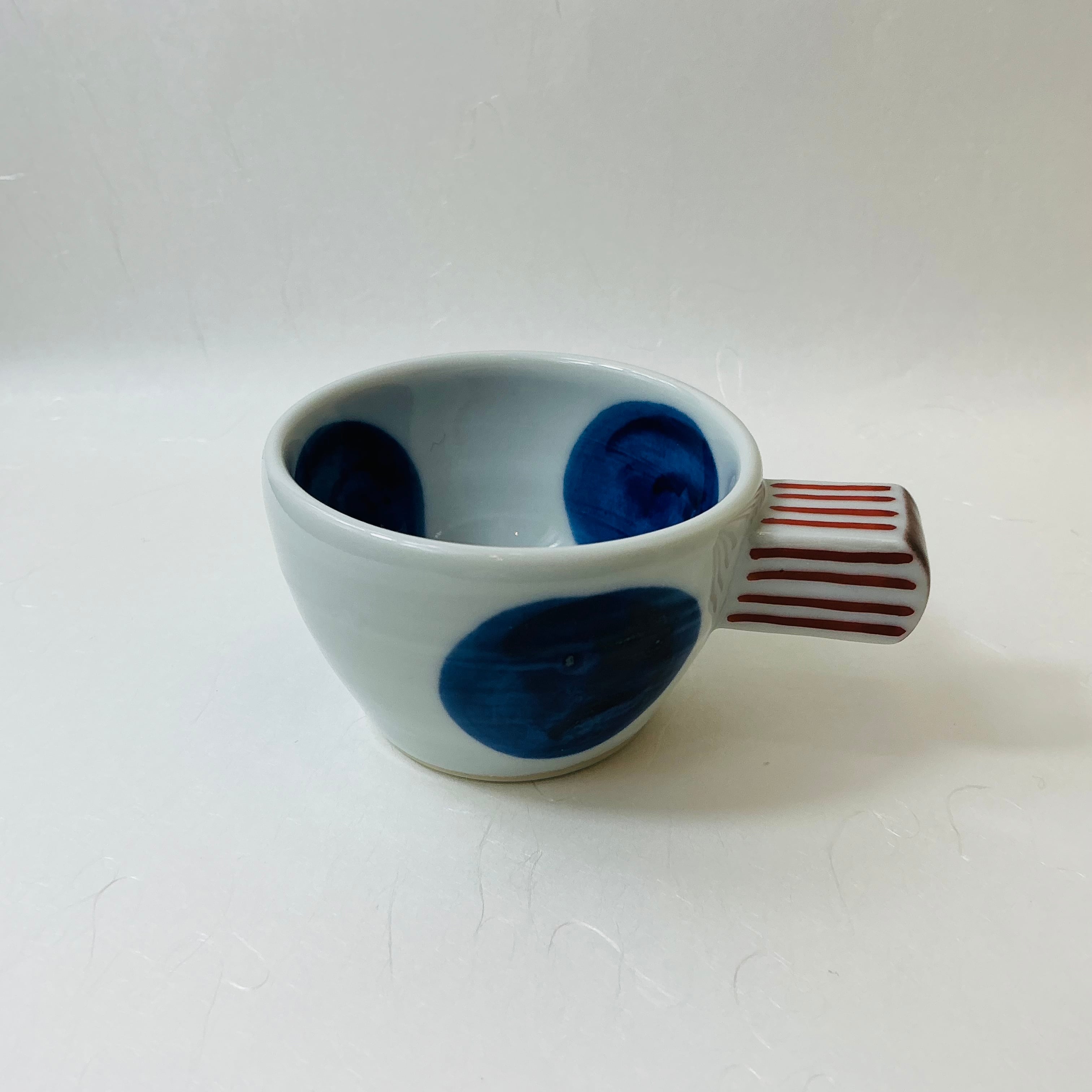 ■人気若手九谷焼作家赤地さんオリジナルデザインのデミタスカップは赤地さんにしか作れないとっても可愛いデザインです。大胆な構図と華やかな色使いが人気です。紺で描かれた大き目のドットがオシャレなあなたにぴったり。